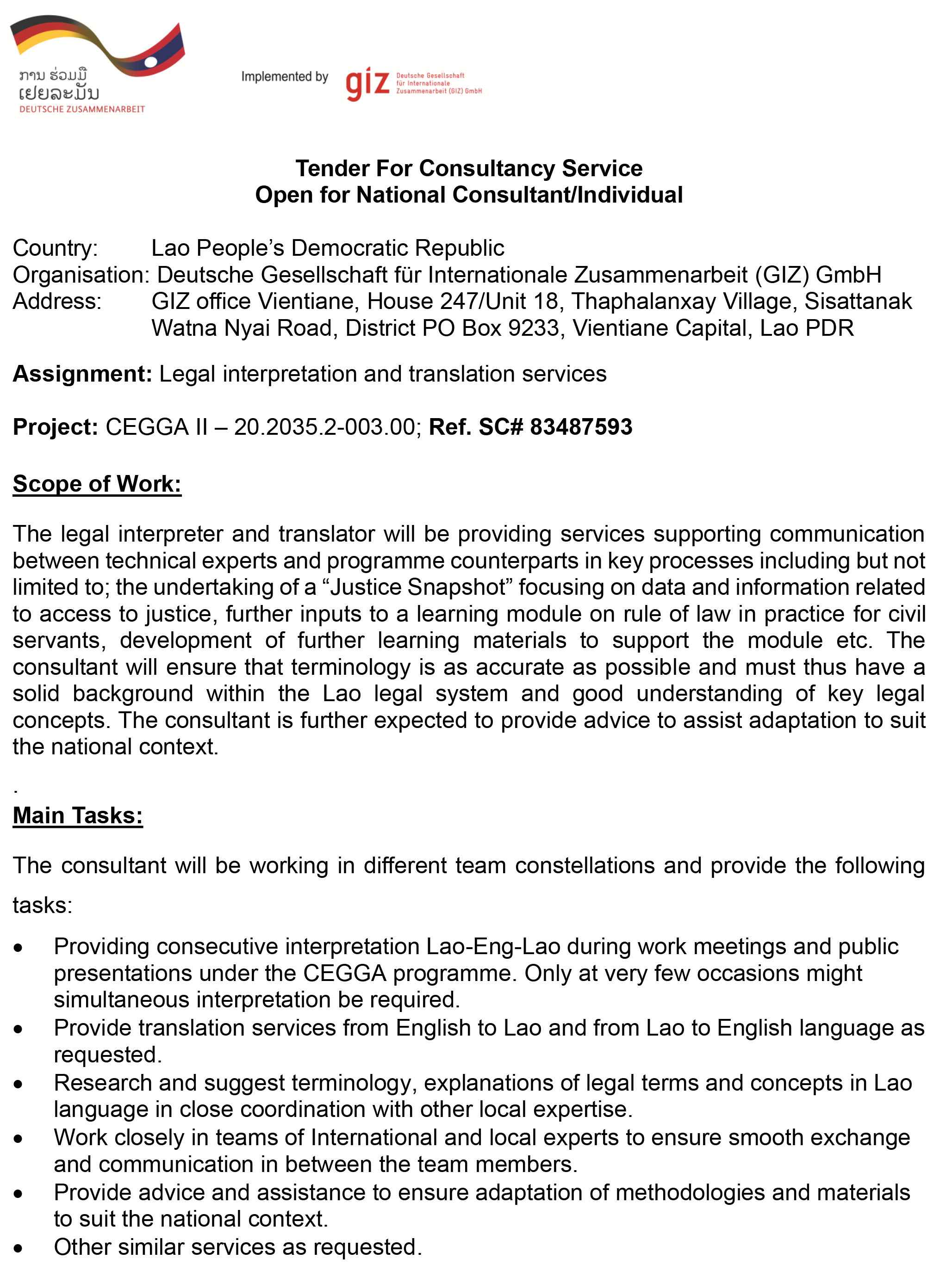 Intertested qualified local consultant/individual are invited to register to obtain more detail information of tender document by sending mail to register: LA_Quotation@giz.de from 08:00 to 16:00 starting 29 April 2025 until dead line submission 20 May 2025. (please indicate your full address, conact number and please use this reference contract number 83487593