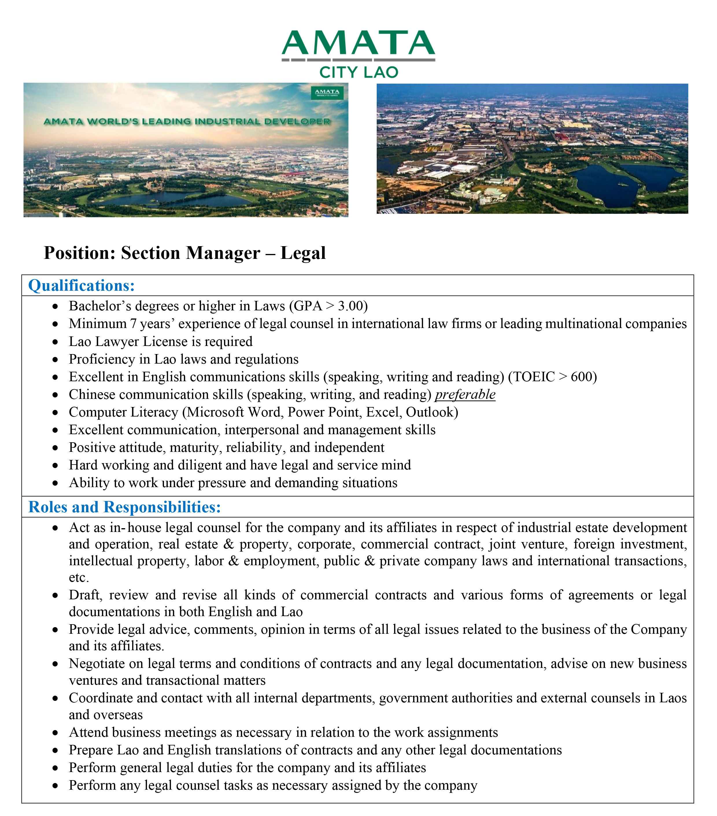 Application Information: Interested candidates please submit a full application using a cover letter and up-to-date CV to Email: recruitment@amata.com, soulita@amata.com