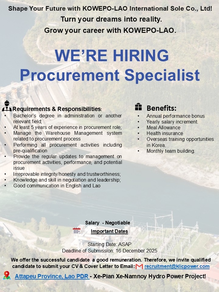 KLIC head office located at the Vientiane Center was established in September 2016 to maintain the daily administration and management of hiring, training and mobilization of recruits to operate and maintain the facilities associated with the Xe-Pian Xe-Namnoy Hydroelectric Power Project located in the southern provinces of Lao PDR. The management and site team for KLIC comprises of highly experienced professionals that have been assembled to create a dynamic and team oriented group.